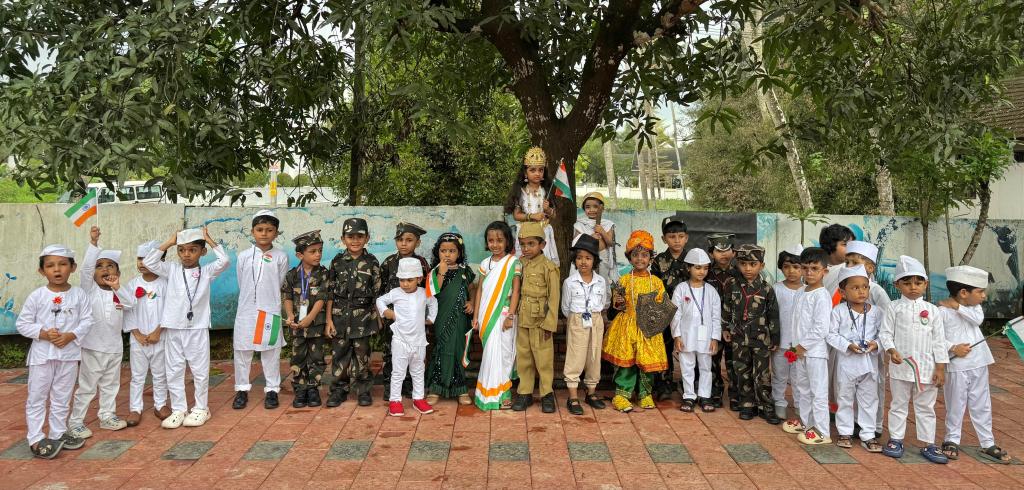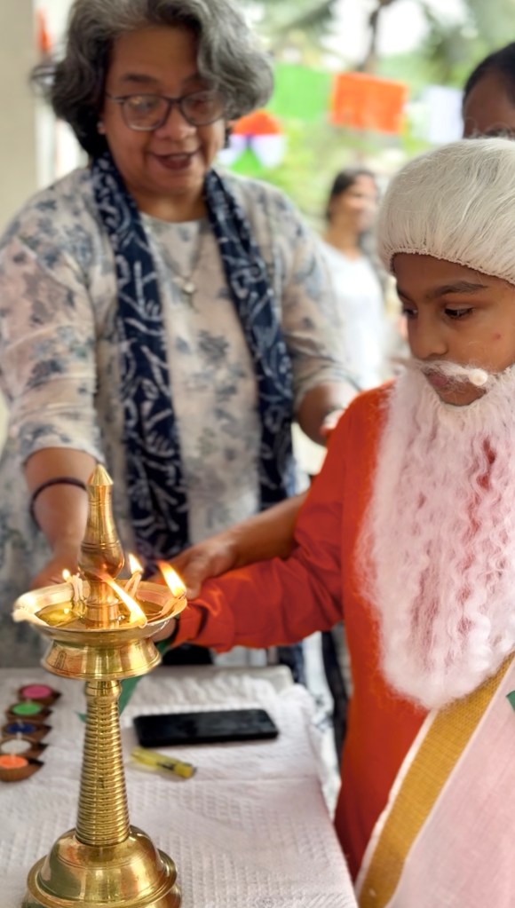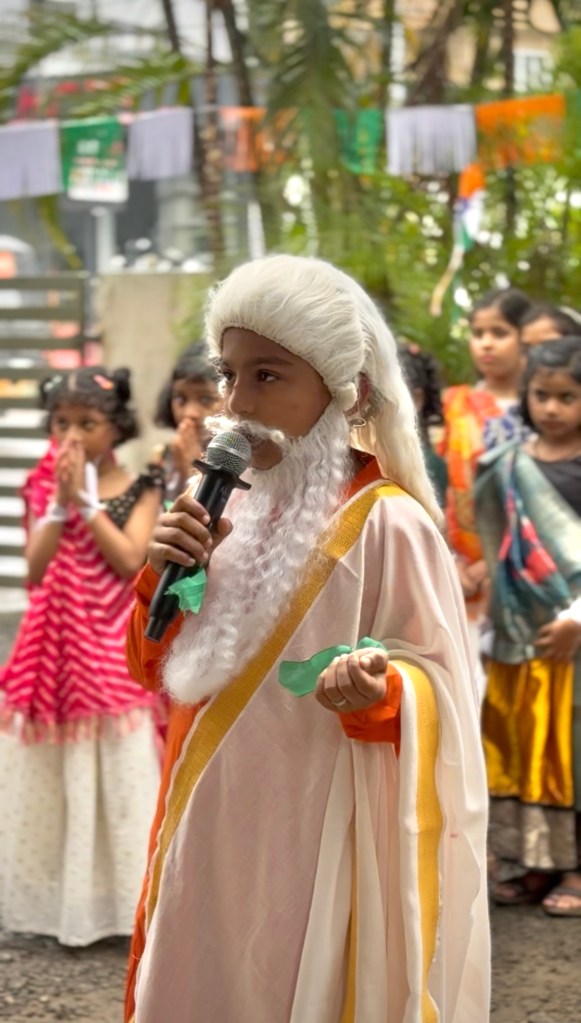 Adding an enriching educational touch, one of our students dressed as Rabindranath Tagore, one of India’s most influential figures in literature, poetry, and philosophy. In his role, the student took us on a journey back in time, recalling key moments of India’s struggle for independence. It was both refreshing and inspiring to hear about India’s history from the perspective of such a towering figure. The performance gave our students a chance not only to learn about Tagore’s contributions but also to understand how visionaries like him shaped the soul of our nation.
